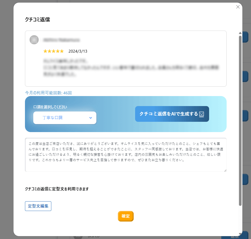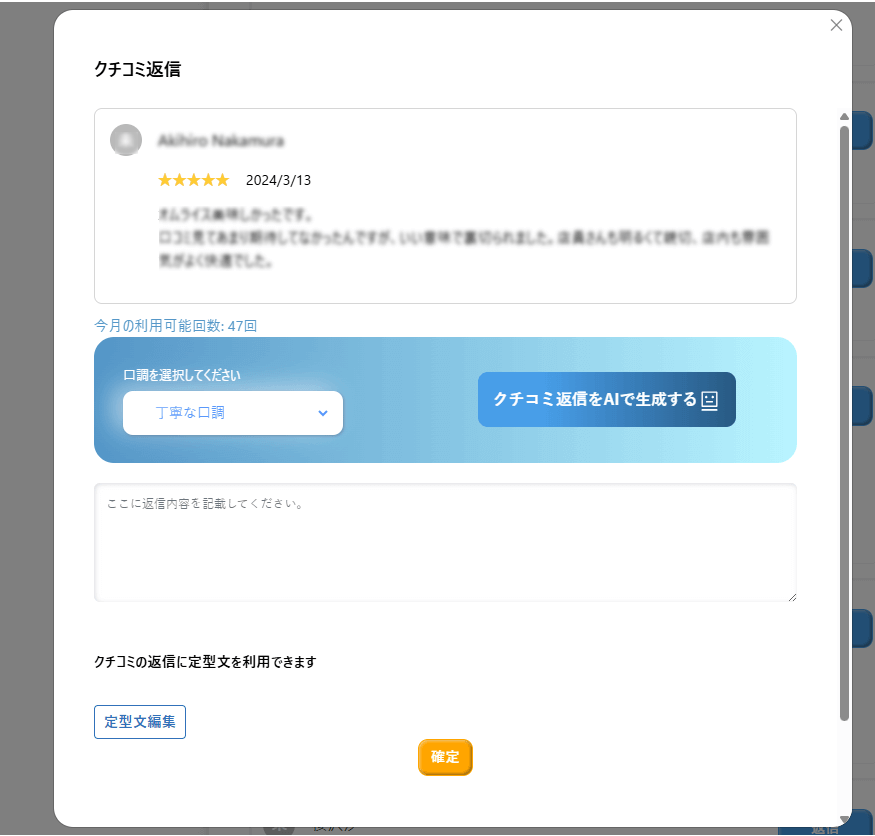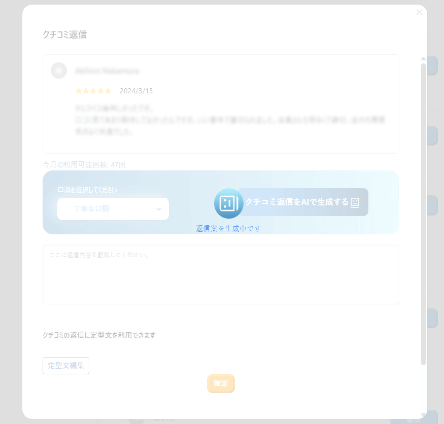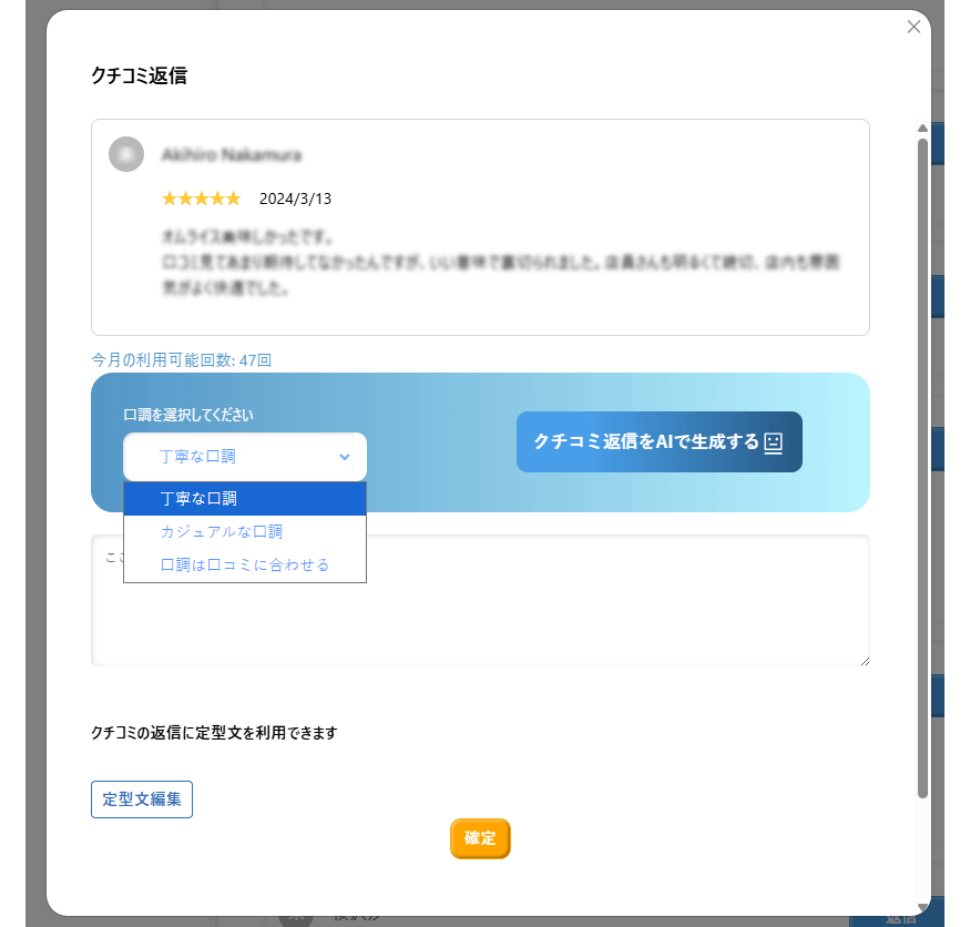 返信案の口調を3パターンから選べるため、お店の雰囲気や対応方針に合わせた返信が可能です。